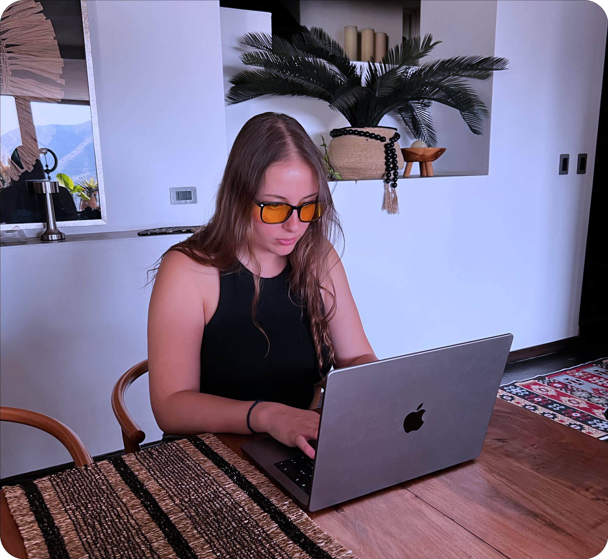Los lentes Solsets DayTIME utilizan un filtro amarillo de alto contraste que bloquea el pico de luz azul más agresiva. Este tinte técnico "suaviza" el brillo de las pantallas y mejora la nitidez del texto, reduciendo el esfuerzo que hacen tus ojos para leer.